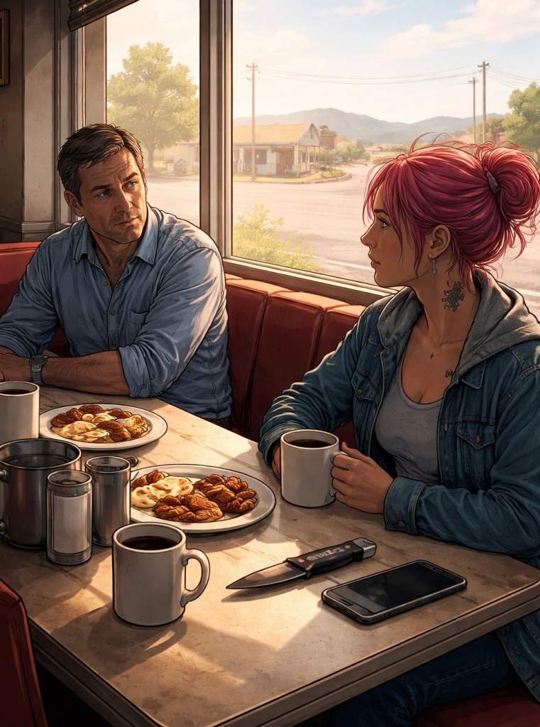 We pulled into Claire’s Diner and took a booth by the window. The server gave us a minute.